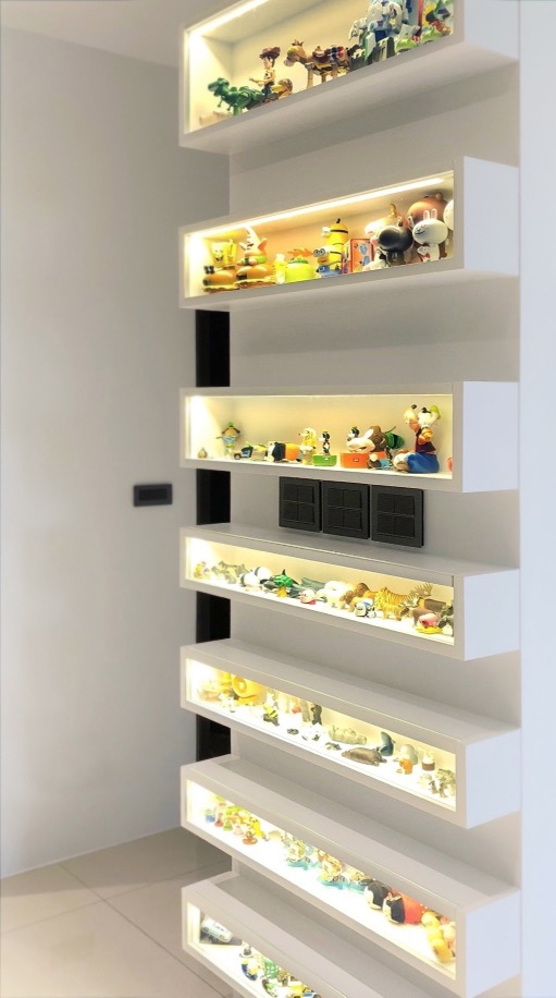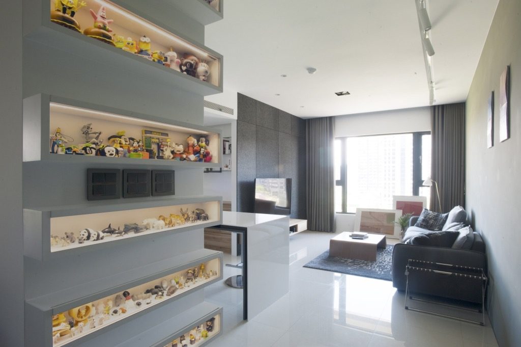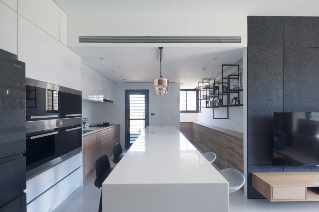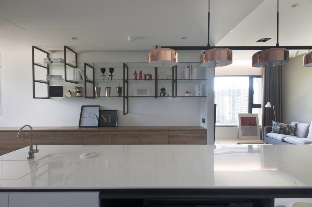業主是家族食品業的第三代,本身也有從事料理直播的工作,所以擁有一個寬敞的廚房,是她一直以來的夢想,我們把原本的三房打掉一房,將一字型廚房與300多公分的大中島結合,廚房、餐廳、客廳串聯起來,延伸空間的視覺性,業主夫婦喜歡到各地旅行,在廚房對面特地設計鐵件玻璃層架書櫃,擺放旅遊的紀念品或是相關書籍,能一邊做菜,一邊回憶屬於兩人的秘密。