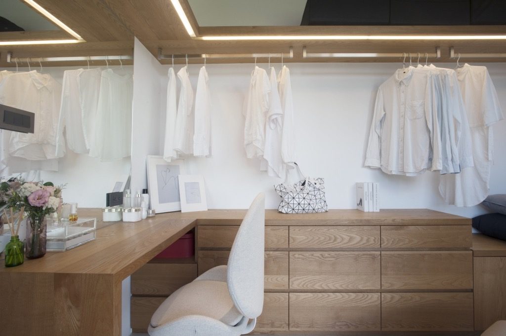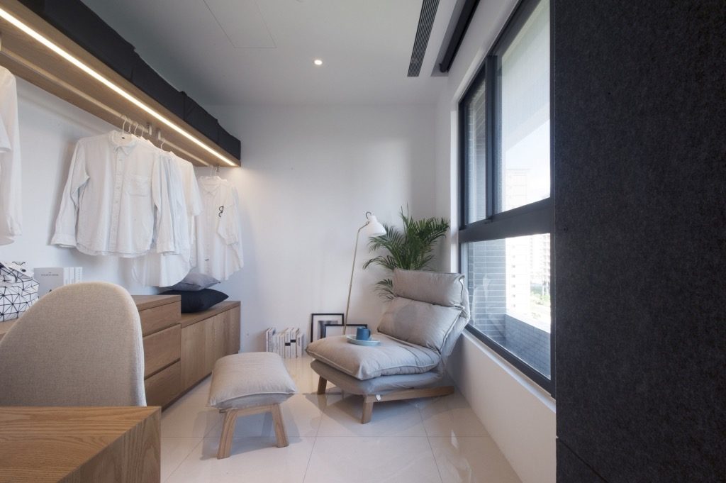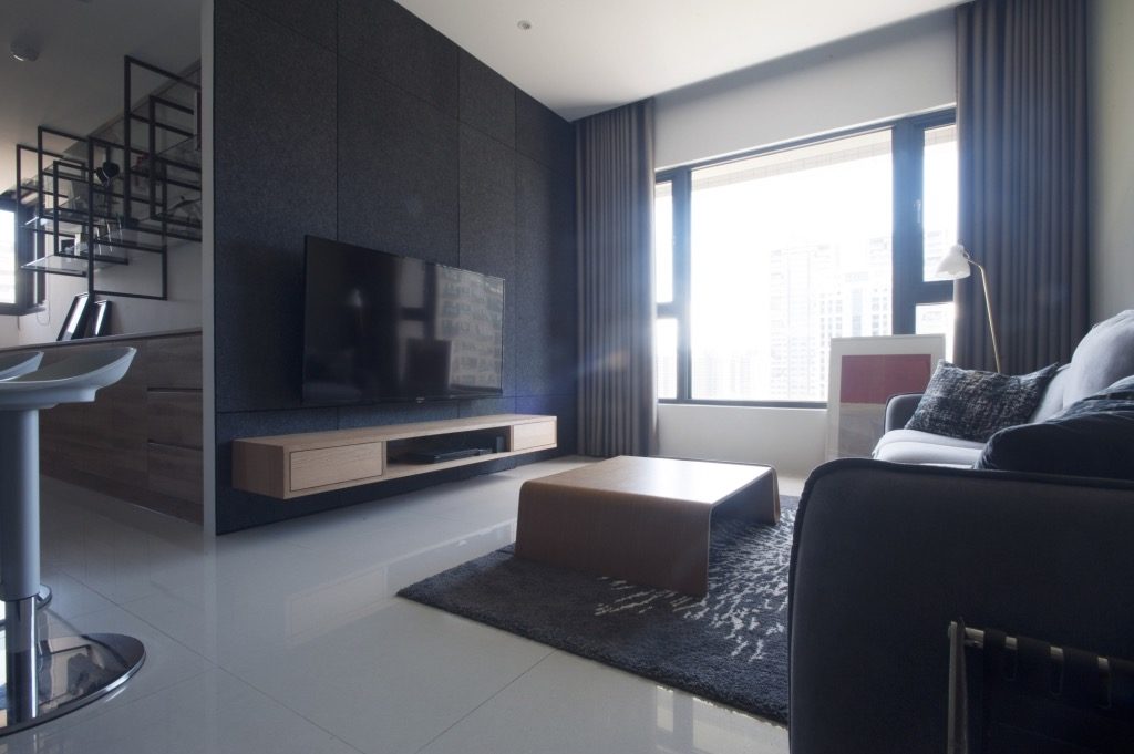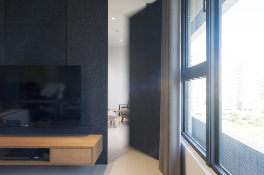 電視牆、臥室床頭主牆用黑色環保羊毛氈包覆,達到隔音的效果,營造出沉穩,但又不失溫暖的氛圍,設計師將休息室隱藏在電視牆後方,可以拿來當作更衣室外,也可作為獨處時,沉思、發呆的好地方。